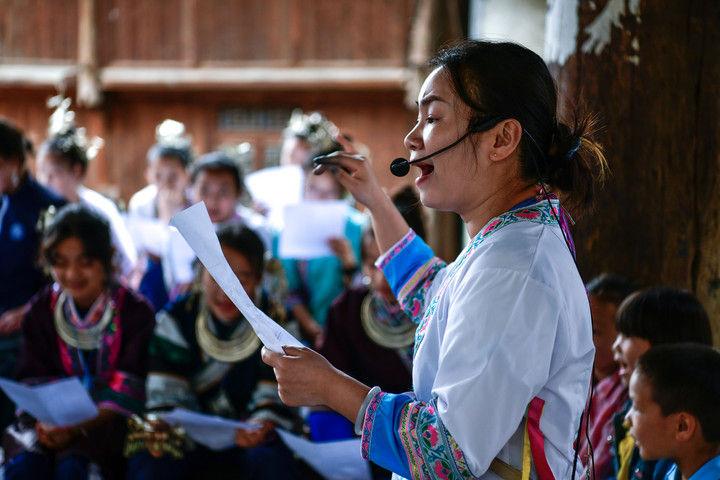 隨著國產(chǎn)動畫電影《哪吒之魔童鬧海》不斷刷新中國影史票房紀(jì)錄,參與電影配樂的貴州省榕江縣三寶侗寨的楊想妮和“舞樂蟬歌”團(tuán)隊為更多人所熟知。樂團(tuán)成員懷揣“用音樂傳遞侗族文化,讓世界聽見侗族大歌”的共同夢想,將侗族大歌推向更廣闊的舞臺。這是2025年4月22日,楊想妮在貴州省黎平縣肇興鎮(zhèn)廈格侗寨教前來研學(xué)的孩子們唱侗歌。