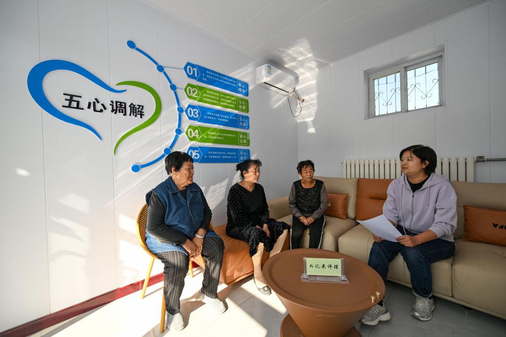 在天津市寧河區(qū)蘆臺(tái)街道金華路社區(qū),社區(qū)黨總支副書記吳蕊(右一)就社區(qū)監(jiān)控設(shè)備安裝問題為社區(qū)居民進(jìn)行解答(2024年10月11日攝)。金華路社區(qū)積極踐行新時(shí)代“楓橋經(jīng)驗(yàn)”,將原社區(qū)居委會(huì)閑置用地提升改造成為聯(lián)絡(luò)群眾的基層綜合治理陣地——“解鈴小院”。新華社記者 孫凡越 攝