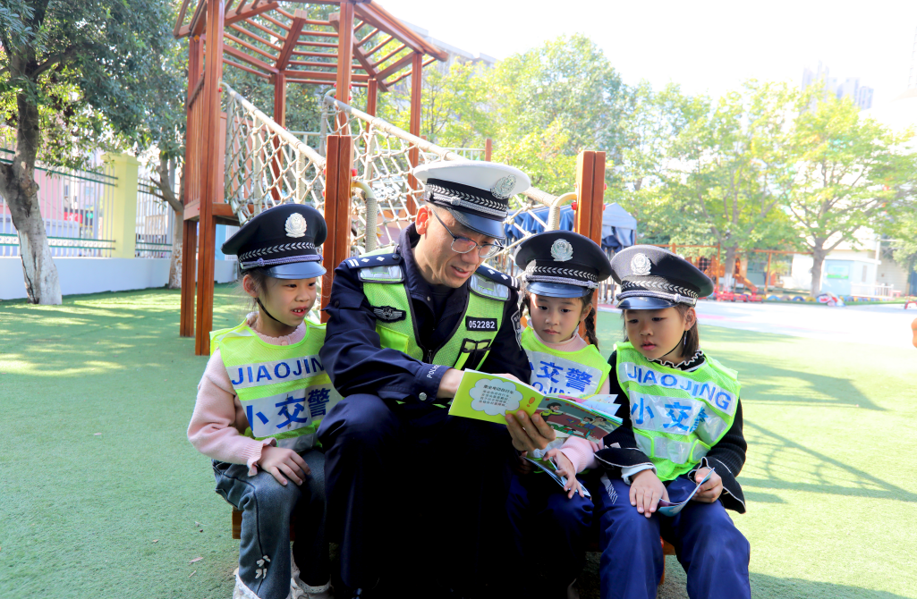 圖為12月1日,民警在分宜縣中心幼兒園向小朋友講解交通安全知識(shí)。