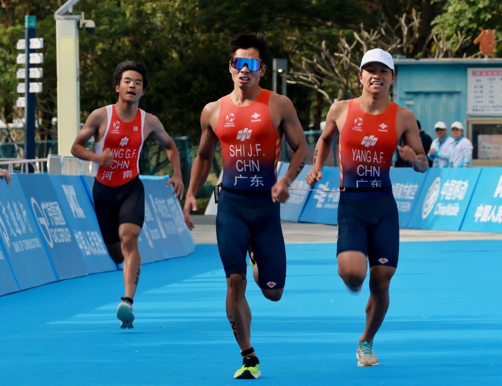 ↑11月27日,廣東一團(tuán)選手石金飛(中)與引導(dǎo)員楊奧富在跑步比賽中沖刺