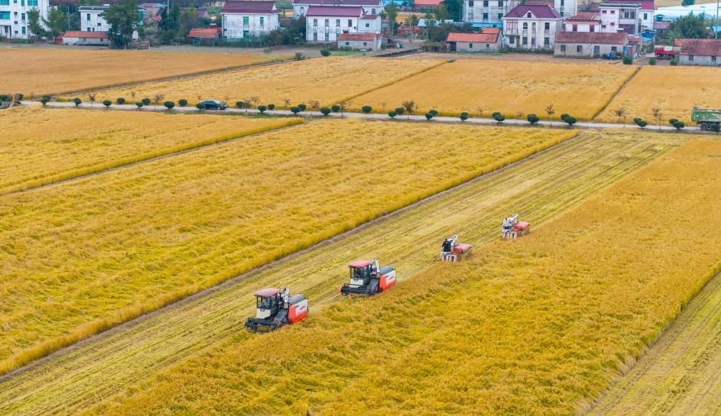 2025年10月30日,在江蘇省南通市通州區(qū)十總鎮(zhèn)育民村高標(biāo)準(zhǔn)農(nóng)田里,村民駕駛農(nóng)機(jī)收割水稻(無人機(jī)照片)。新華社發(fā)