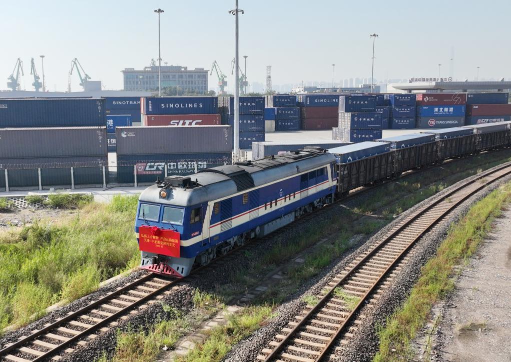 2025年10月13日拍攝的天津-中亞圖定班列首發(fā)現(xiàn)場(chǎng)(無人機(jī)照片)。新華社記者 李然 攝