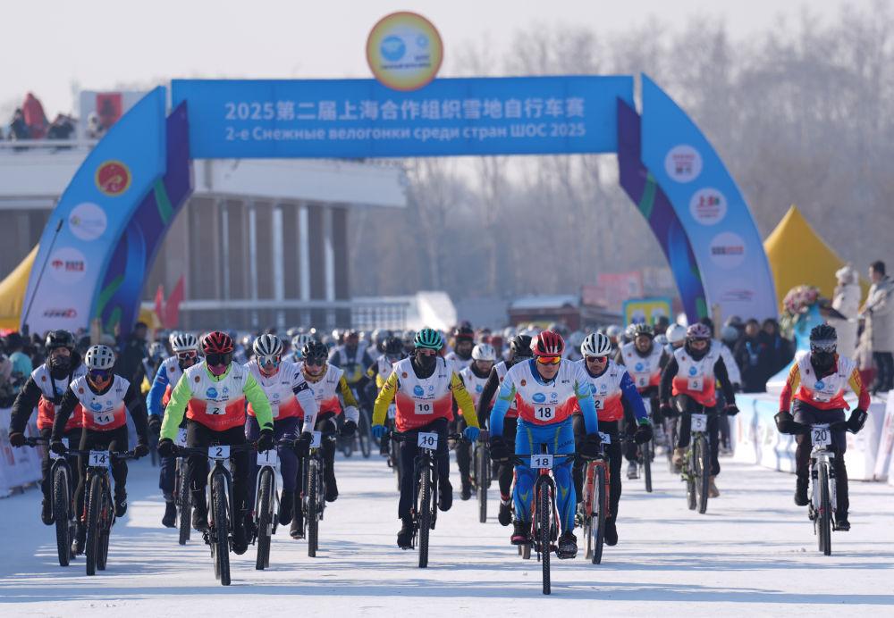 2025年1月11日,選手在哈爾濱太陽(yáng)島風(fēng)景區(qū)參加2025第二屆上海合作組織雪地自行車(chē)賽。