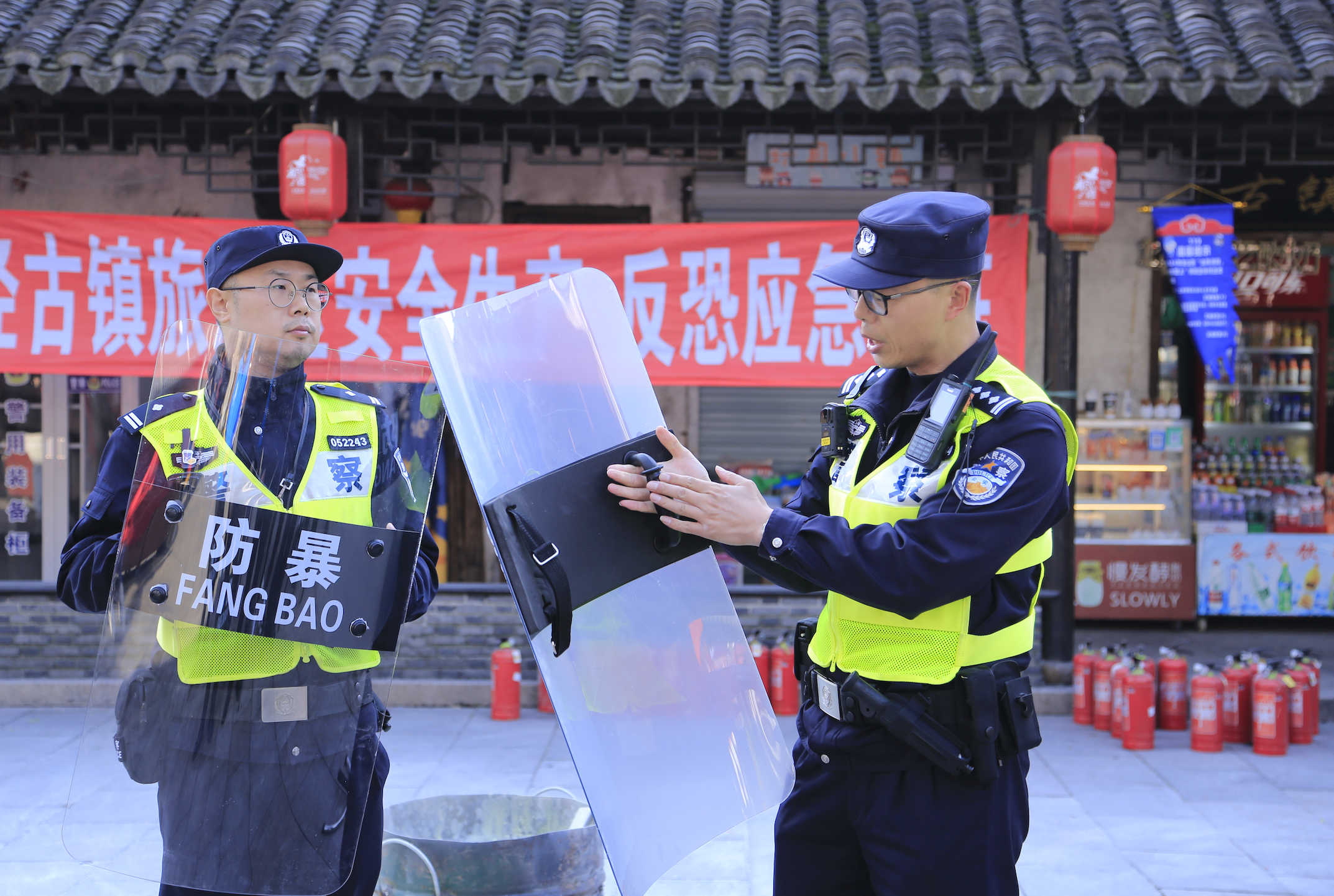 漫步古鎮(zhèn)街巷,只要細(xì)心觀察便會(huì)發(fā)現(xiàn),不少商戶的門頭上都懸掛著帶有統(tǒng)一標(biāo)識(shí)的 “平安燈”,每隔一段距離就設(shè)有一間配有密碼鎖的“平安屋”。屋內(nèi)整齊擺放著鋼叉、盾牌等治安防護(hù)裝備,密碼由周邊商戶共同掌握。公安、消防等部門會(huì)定期組織商戶開展應(yīng)急處突、消防演練等專項(xiàng)活動(dòng),一旦遇到緊急情況,商戶們能夠快速取出“平安屋”內(nèi)的裝備進(jìn)行先期處置,并第一時(shí)間向?qū)俚嘏沙鏊鶊?bào)告。