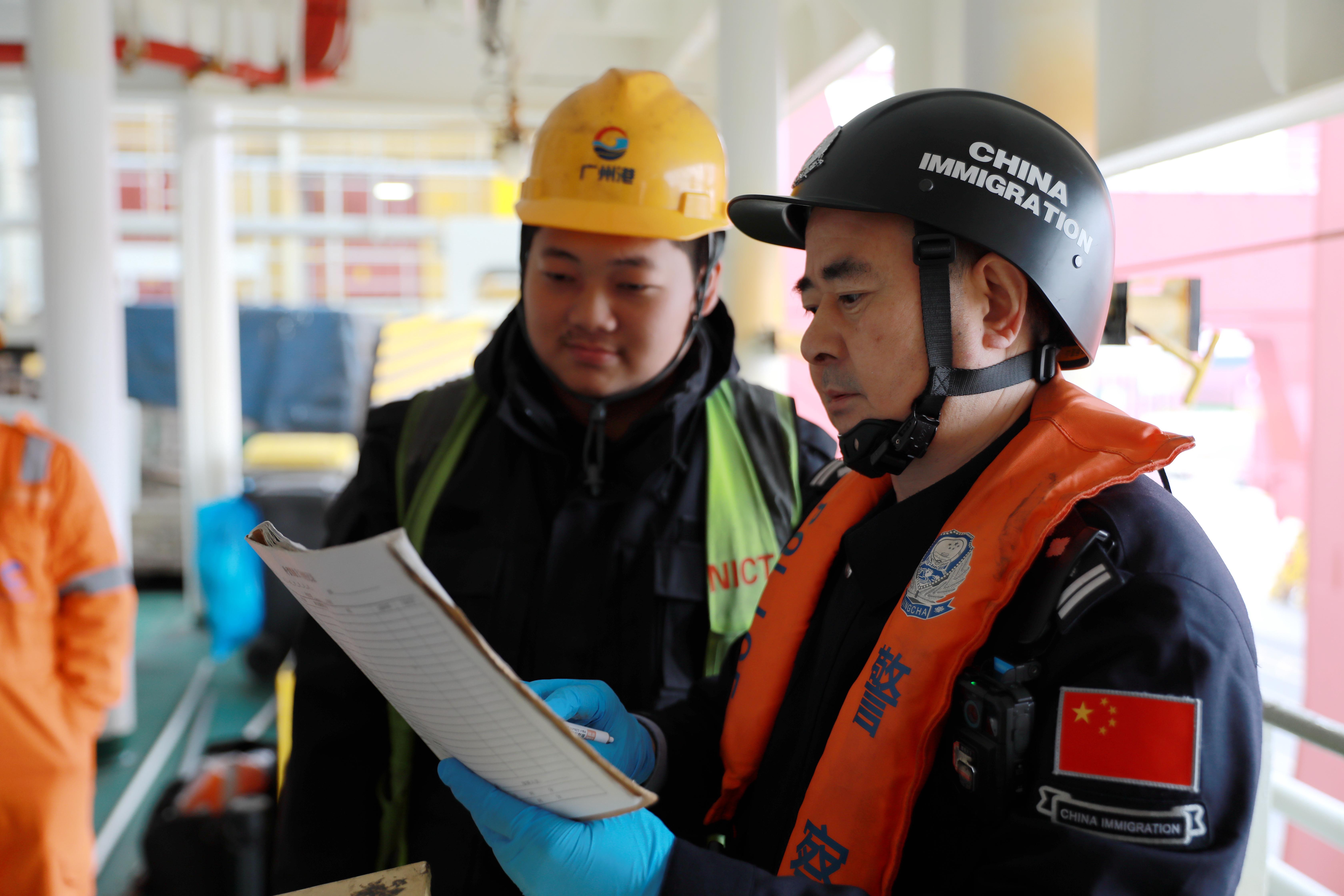 王京義(右一)正在仔細(xì)檢查核對國際航行船舶梯口登記情況。