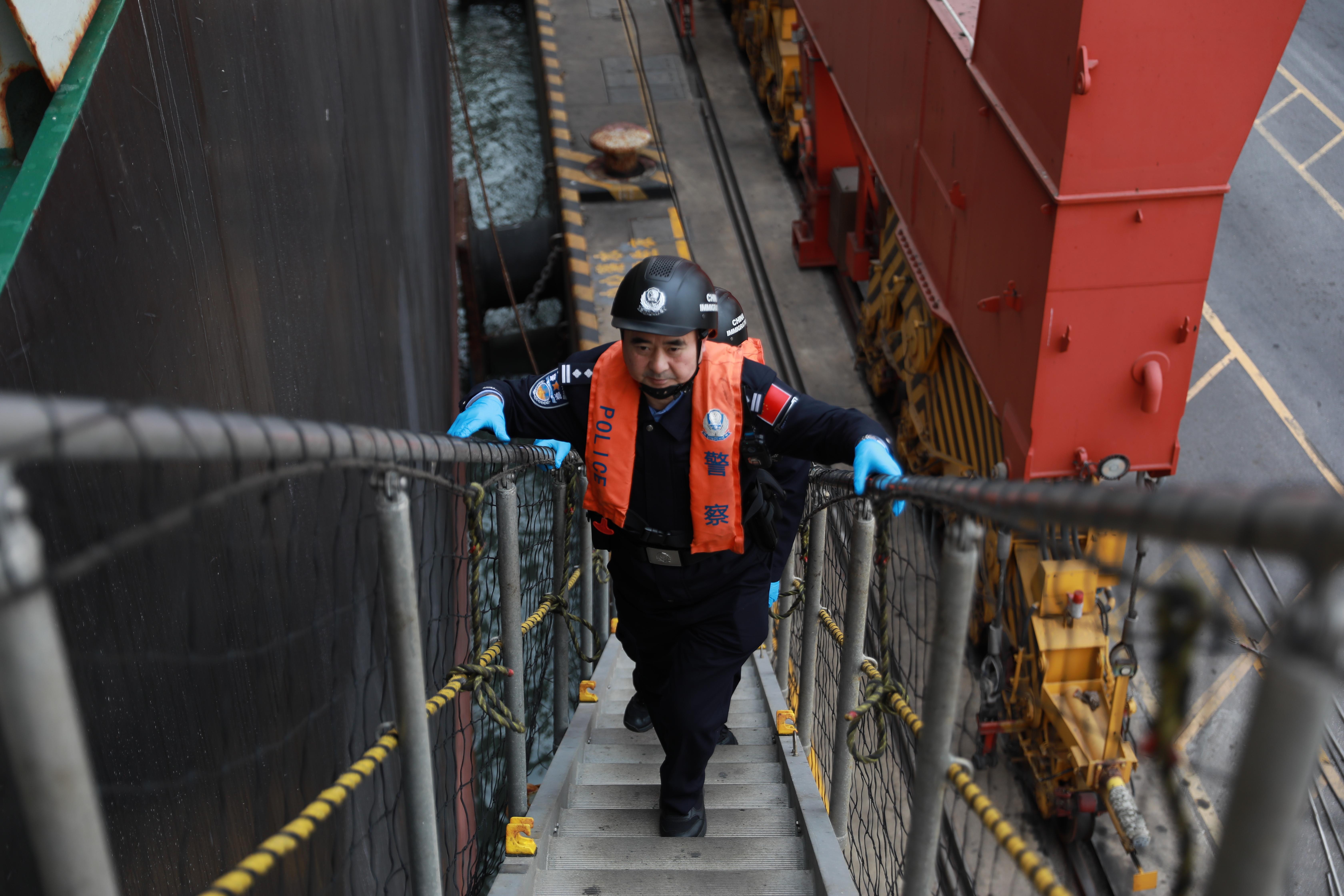 王京義正帶隊攀登舷梯,對“地中海雅典號”船舶開展登臨檢查。
