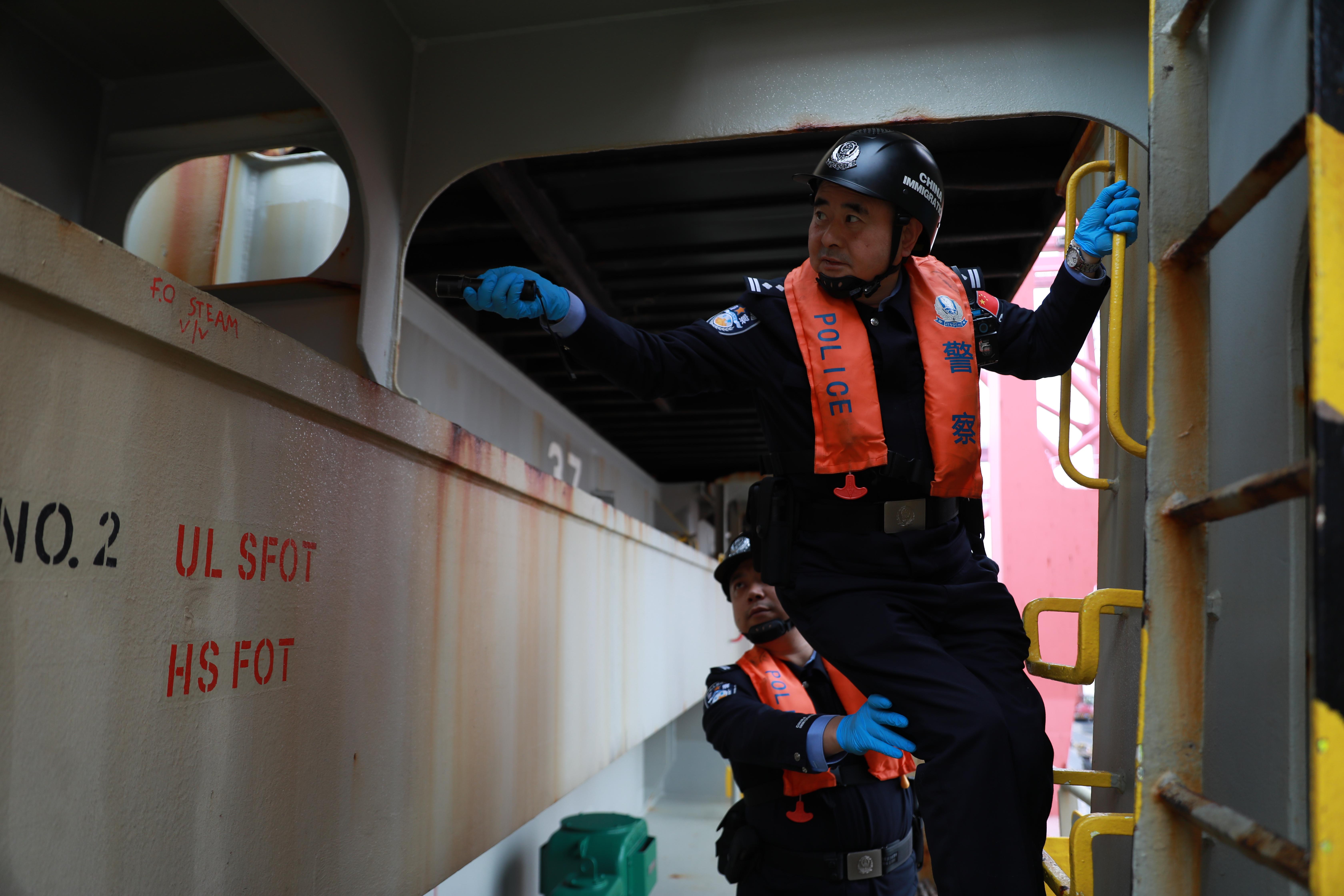 備齊執(zhí)法裝備,戴上安全頭盔,再穿上救生衣,王京義一口氣登上數(shù)十米高的舷梯。還有兩年就要退休的他依然矯健,竟絲毫未見喘氣。梯口督導(dǎo)、證件核對、船艙檢查,只見他眉頭微蹙、目光專注,每一項工作都一絲不茍?!暗巧洗?,我們代表的就是國家。把國門口岸管控風(fēng)險降到最低,不僅是對船企負(fù)責(zé),更是對國家負(fù)責(zé)。”