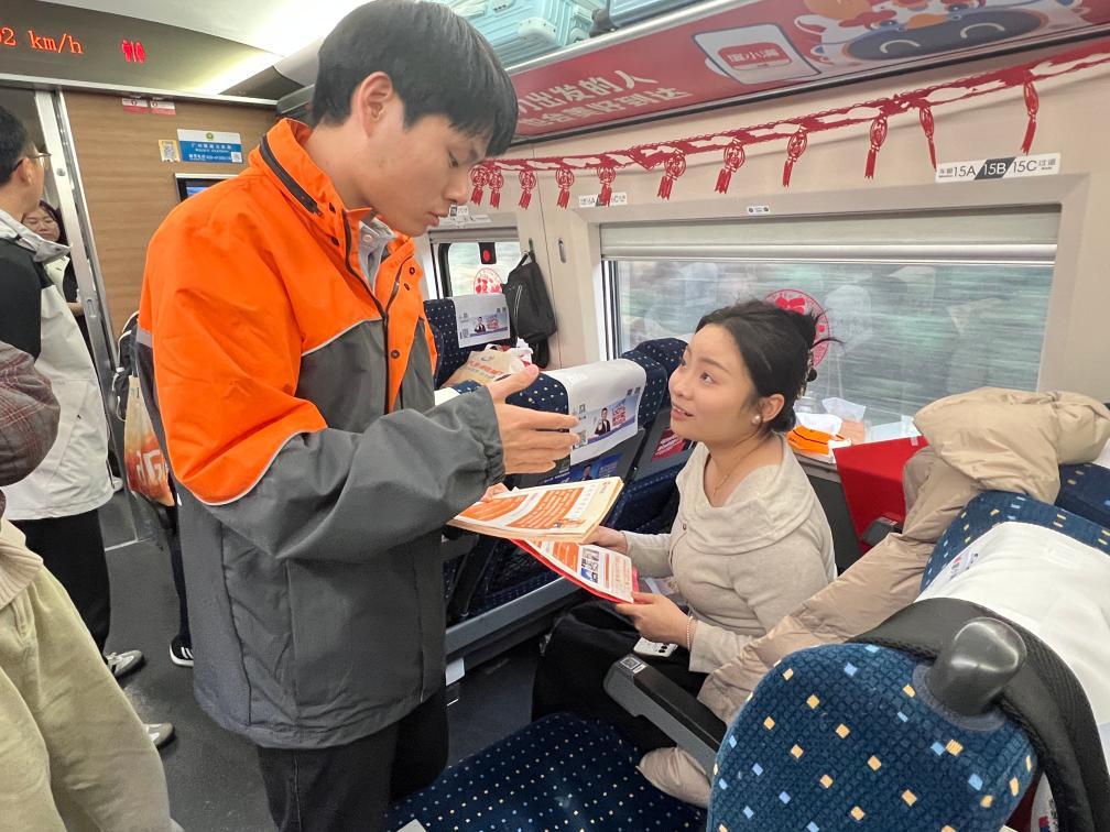 返鄉(xiāng)專列上,一場別開生面的“移動春招會”同步展開。乘客現(xiàn)場掃描二維碼,可查閱到荊門近2.6萬個招聘崗位信息?!袄相l(xiāng)們,要是大家年后想在家門口就業(yè)創(chuàng)業(yè),可以隨時聯(lián)系我們?!鼻G門市人社部門工作人員鄭文杰的一席話,溫暖又親切。
