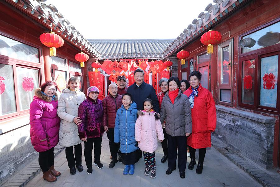2019年2月1日上午,習近平總書記來到前門東區(qū)草廠四條胡同看望慰問群眾時,同市民侯雅明一家合影。新華社記者 鞠鵬 攝