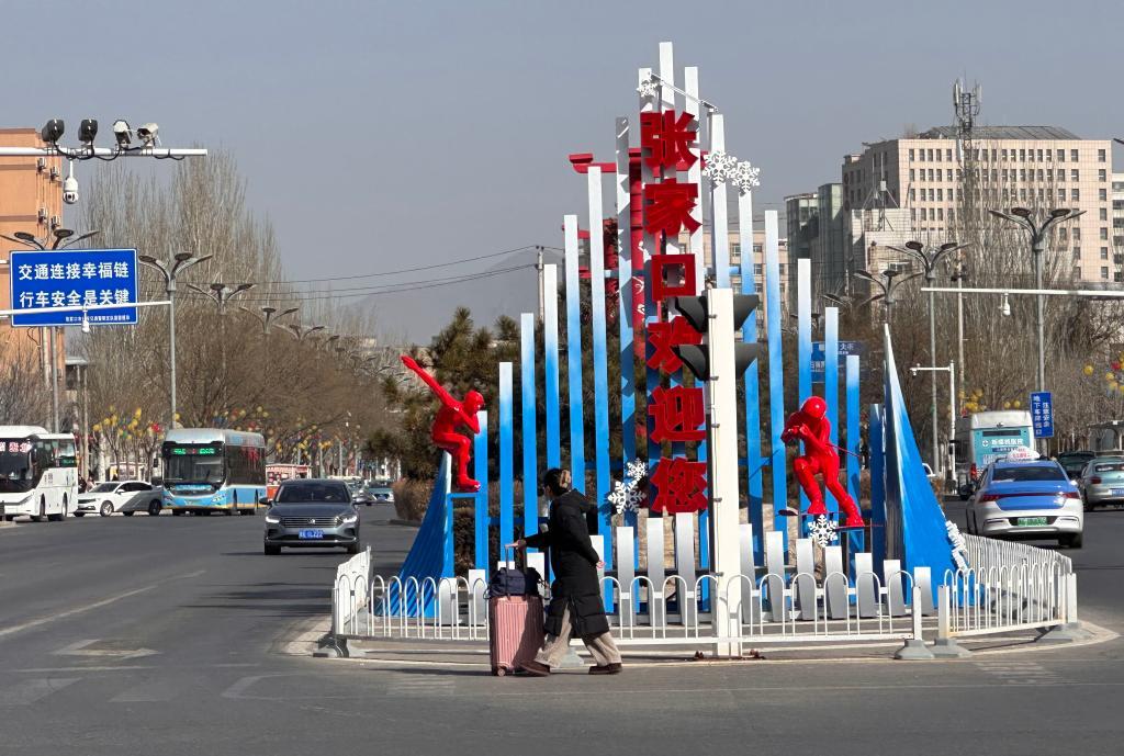 2月20日,一名前往京張高鐵張家口站的旅客路過帶有冬奧會標志的歡迎牌。新華社記者 唐霽 攝