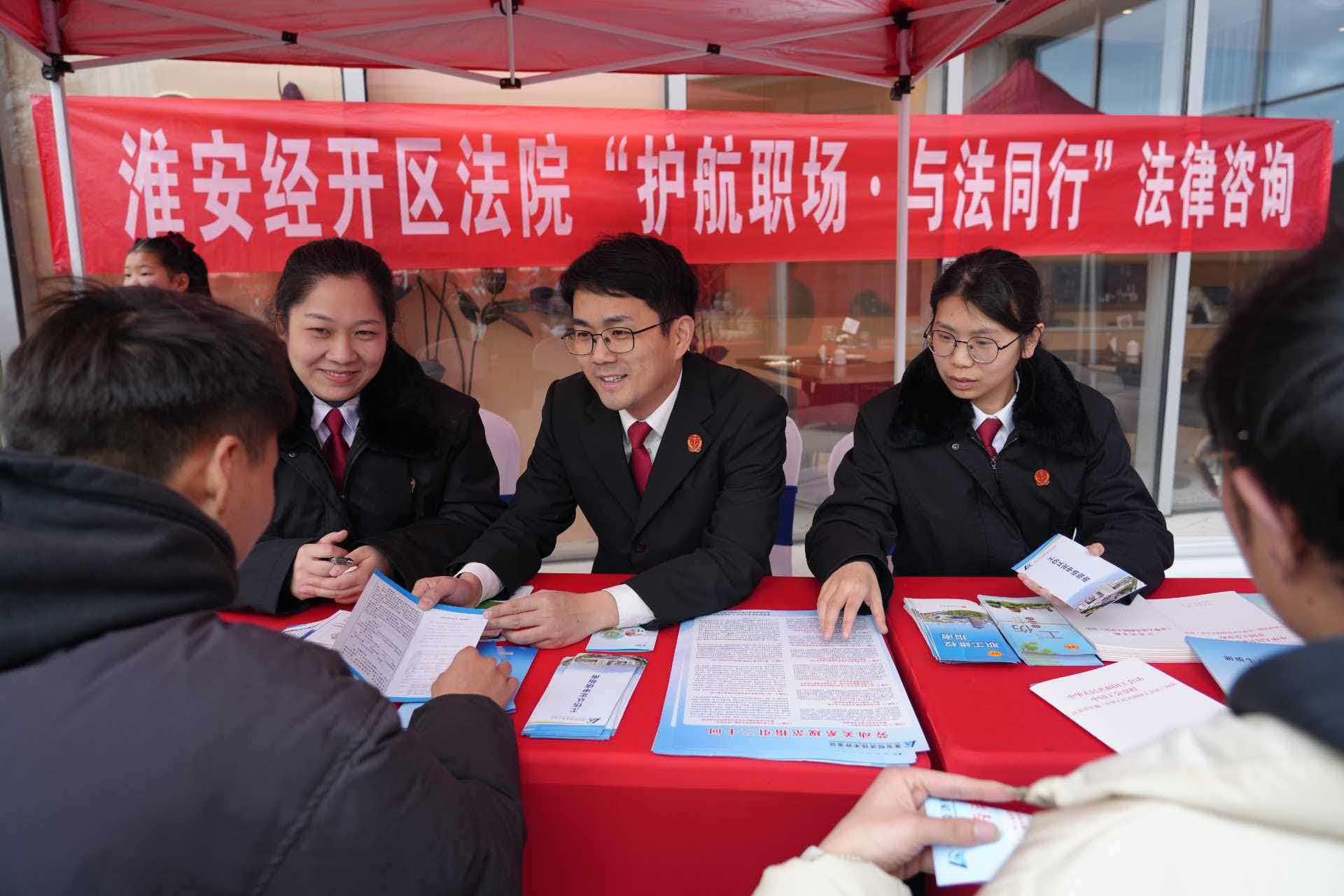 當(dāng)天,江蘇省淮安經(jīng)濟技術(shù)開發(fā)區(qū)人民法院勞動爭議調(diào)處法官團隊將司法服務(wù)“直通車”開進(jìn)了新春招聘會現(xiàn)場。江淮大地年味尚濃,招聘市場人頭攢動,法院的服務(wù)攤位前很快圍滿了求職者。