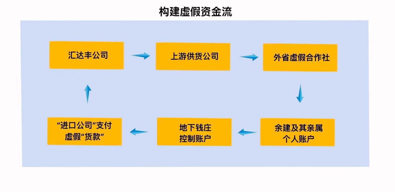 順著這條異常的資金線索深查,一條清晰的虛假循環(huán)路徑浮出水面:匯達(dá)豐公司收到外匯或者退稅款后,便迅速以“貨款”名義轉(zhuǎn)給上游供貨商,上游供貨商隨即轉(zhuǎn)給合作社,合作社扣除部分費(fèi)用后,退稅款最終轉(zhuǎn)入余建親屬的銀行賬戶,外貿(mào)貨款則轉(zhuǎn)入地下錢莊交易人員的賬戶。