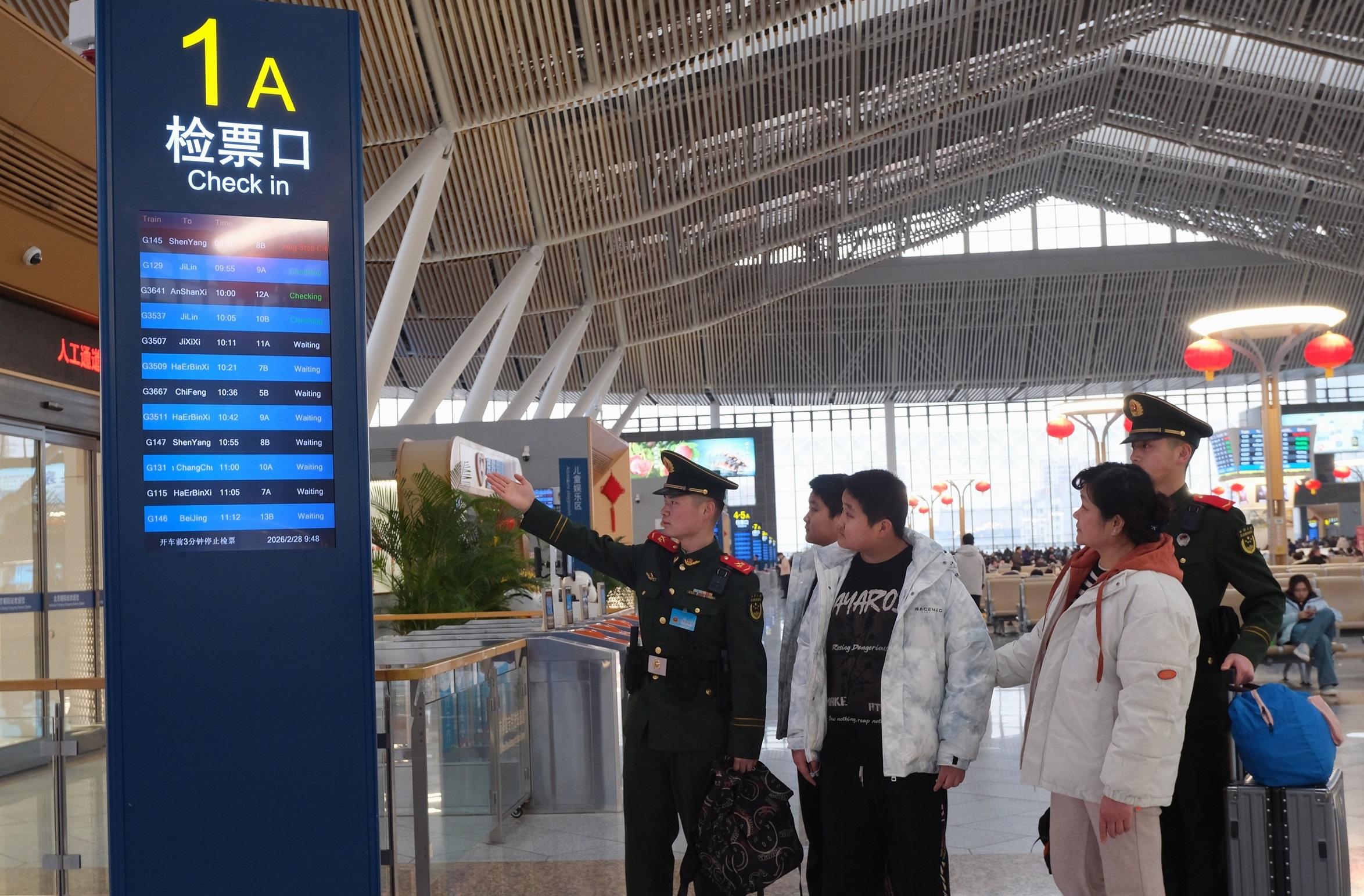 朝陽站旅客眾多,人聲撲面而來。廣播里反復(fù)播報著檢票信息,嘈雜的說話聲,行李箱滾輪的咕嚕聲,揉成一片。記者看到,人流密集的進(jìn)站口、安檢區(qū)、候車大廳、檢票口等關(guān)鍵點位,執(zhí)勤武警始終保持高度警惕,細(xì)致排查各類安全隱患。
