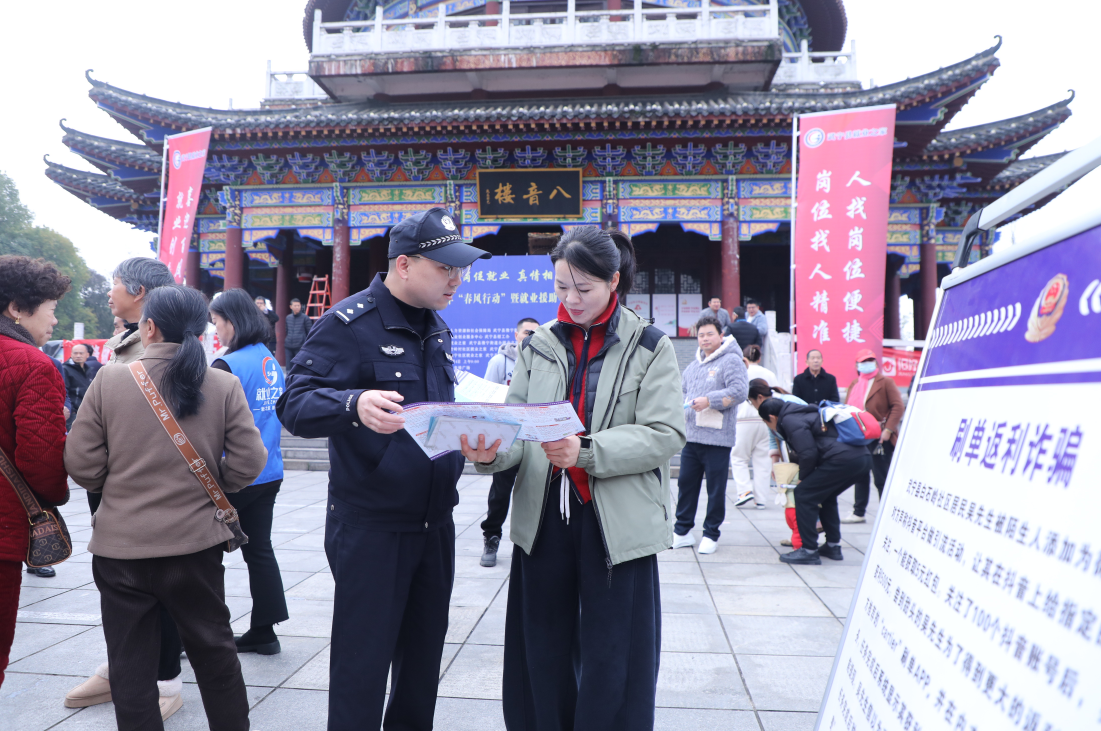 圖為民警在八音樓廣場(chǎng)向求職群眾宣傳反詐知識(shí)。
