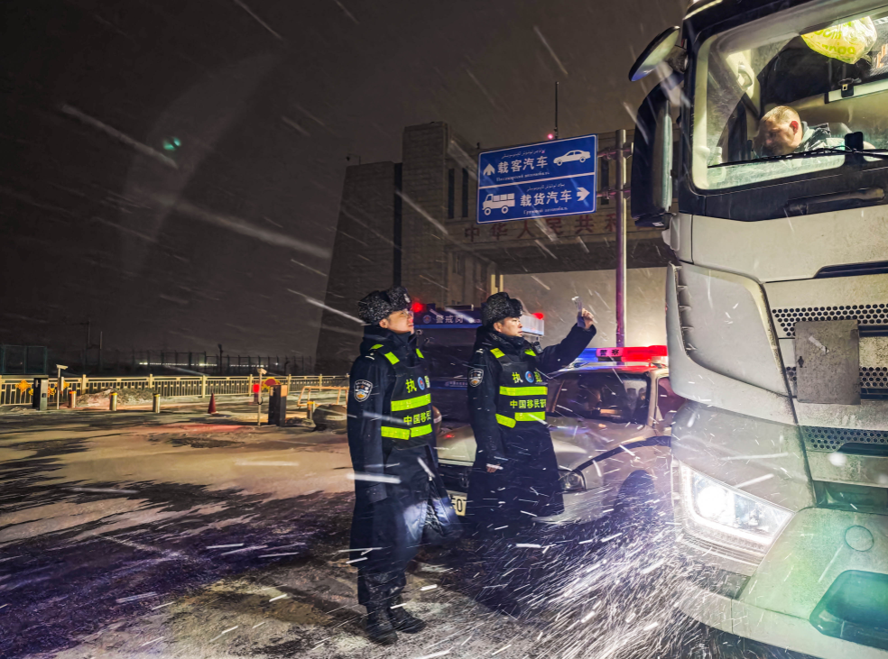 3月10日深夜,十二級(jí)大風(fēng)突襲新疆阿拉山口口岸,口岸鐵路綜合查驗(yàn)場燈火通明??耧L(fēng)掠過鐵軌,卷起細(xì)碎的沙石,砸在正在現(xiàn)場執(zhí)勤的新疆出入境邊防檢查總站阿拉山口出入境邊防檢查站民警們的身上,噼啪作響。