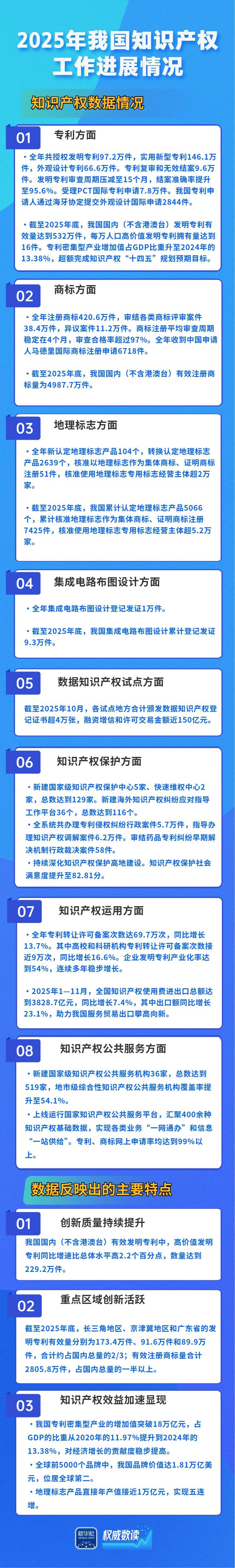 發(fā)明專利有效量達(dá)532萬(wàn)件,人工智能專利有效量居全球前列,地理標(biāo)志產(chǎn)品直接年產(chǎn)值實(shí)現(xiàn)五連增……在23日國(guó)新辦新聞發(fā)布會(huì)上,國(guó)家知識(shí)產(chǎn)權(quán)局介紹2025年我國(guó)知識(shí)產(chǎn)權(quán)工作進(jìn)展情況。跟隨海報(bào),一起來(lái)看看吧。