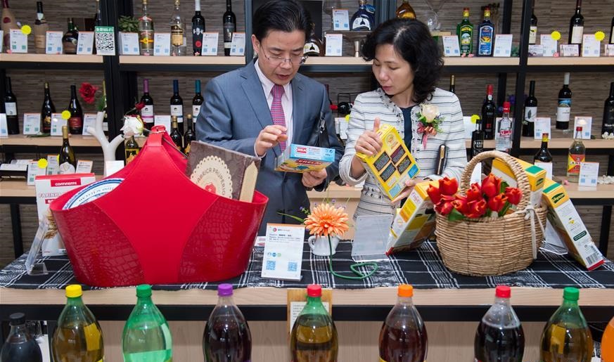 來賓在設(shè)立于澳門的葡語國家食品集散中心的線下實體店——葡語國家食品展示中心參觀(2017年3月31日)。新華社記者 張金加 攝