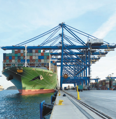 11月6日,一艘貨輪在中遠(yuǎn)海運比雷埃夫斯港集裝箱3號碼頭裝卸貨物。 本報記者 韓秉宸攝