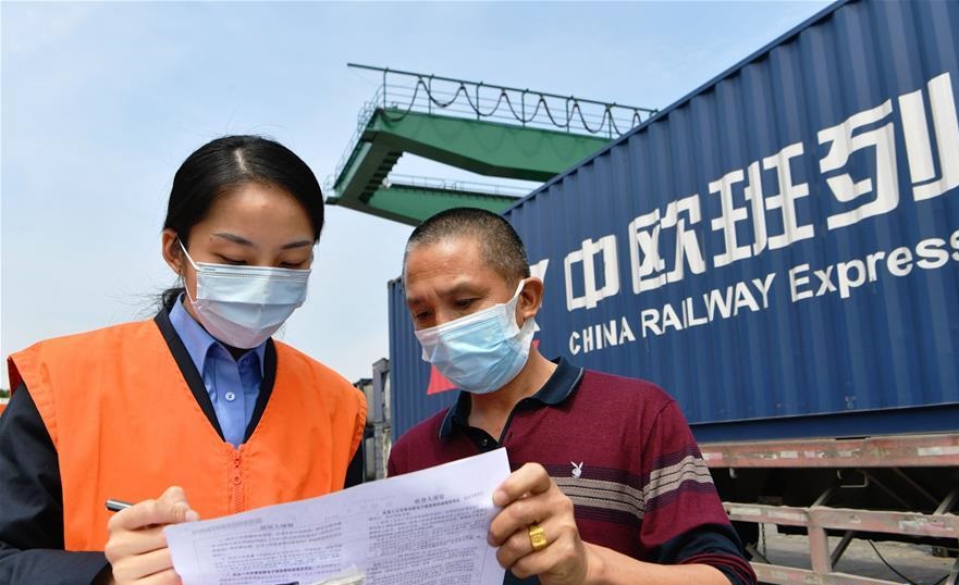 4月25日,中國鐵路南昌局集團(tuán)有限公司海滄站貨運(yùn)員李瑩(左)在廈門海滄站和發(fā)貨方代表辦理中歐班列貨物進(jìn)站交接手續(xù)。 當(dāng)日,中歐班列X8098次貨物列車從福建廈門海滄站出發(fā),開往德國漢堡。這趟中歐班列搭載50個(gè)40尺標(biāo)準(zhǔn)集裝箱,裝有一次性防疫口罩、簡(jiǎn)易呼吸器、輸液器、防護(hù)服等約468萬件防疫物資,以及服裝、電子產(chǎn)品等貨物。 據(jù)中國鐵路南昌局集團(tuán)有限公司數(shù)據(jù)統(tǒng)計(jì),2020年第一季度,漳州車務(wù)段海滄站已累計(jì)開行中歐班列66列,裝車3014輛,貨物價(jià)值約2億美元;與2019年同期相比,開行列數(shù)增長88%,裝運(yùn)量增長196%,運(yùn)輸收入增長219%。 新華社記者 魏培全 攝