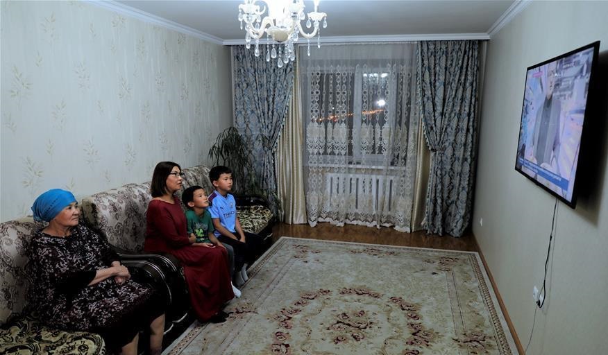 10月9日,在哈薩克斯坦努爾蘇丹,當(dāng)?shù)鼐用裨诩抑杏^看“一帶一路”紀(jì)錄片《你好,哈薩克斯坦》。