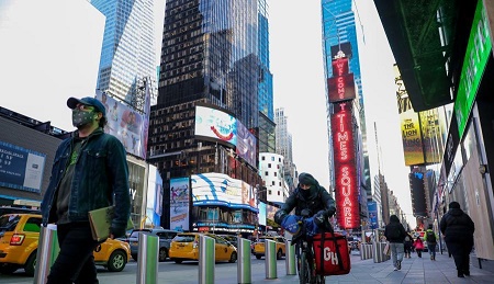 11月18日,行人走在美國(guó)紐約時(shí)報(bào)廣場(chǎng)。新華社記者 王迎 攝