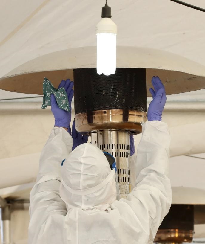 12月14日,一名工作人員在韓國首爾龍山區(qū)一處臨時篩查所工作間隙靠近暖爐取暖。