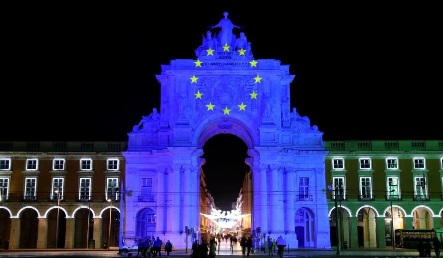 1月1日,葡萄牙里斯本的奧古斯塔街拱門(mén)上投影出歐盟旗幟的配色。