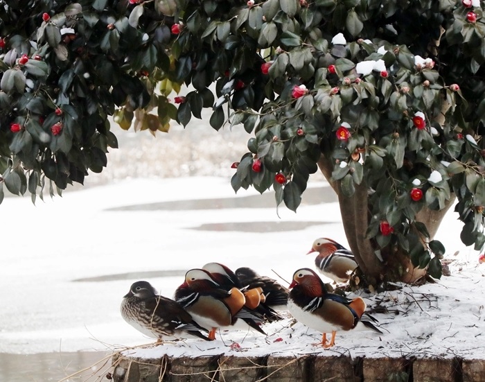 當?shù)貢r間2月18日,韓國光州,一群鴛鴦在雪中嬉戲。(圖片來源:東方IC)