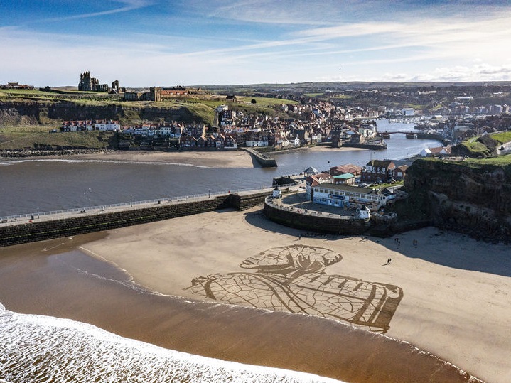 人民網(wǎng)訊 當(dāng)?shù)貢r(shí)間3月15日,英國(guó)惠特比,在世界水日來(lái)臨之前,水援助組織在惠特比海灘的沙灘上創(chuàng)作了一幅畫(huà),畫(huà)中的孩子在漲潮的潮水旁提水,以強(qiáng)調(diào)氣候變化對(duì)人們獲取水的影響。