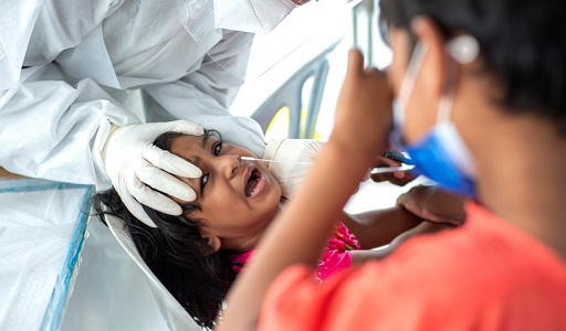 5月10日,在馬來西亞吉隆坡附近,醫(yī)務(wù)人員為一個女孩進行新冠病毒檢測取樣。新華社發(fā)(張紋綜 攝)