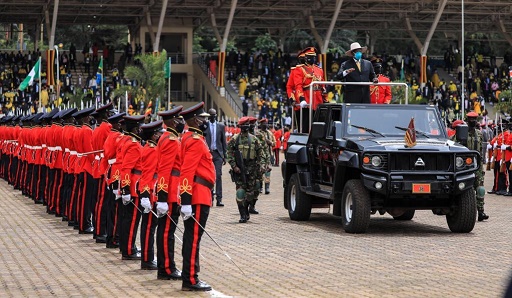 5月12日,穆塞韋尼(右前)在烏干達(dá)坎帕拉出席總統(tǒng)就職典禮時檢閱儀仗隊。