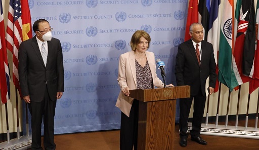5月16日,在位于紐約的聯合國總部,中國常駐聯合國代表張軍(左)同挪威常駐聯合國代表莫娜·尤爾(中)、突尼斯常駐聯合國代表拉德布共同會見記者。新華社記者 謝鍔 攝