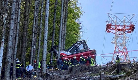 5月23日,救援人員在意大利皮埃蒙特區(qū)的纜車事故現(xiàn)場工作。