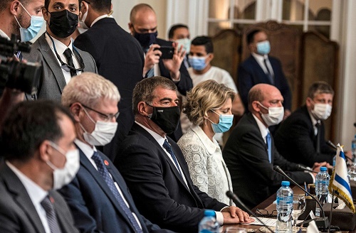 5月30日,以色列外交部長阿什克納齊(前排左三)在埃及開羅與埃及外交部長舒凱里(不在畫面中)舉行會談。新華社/法新