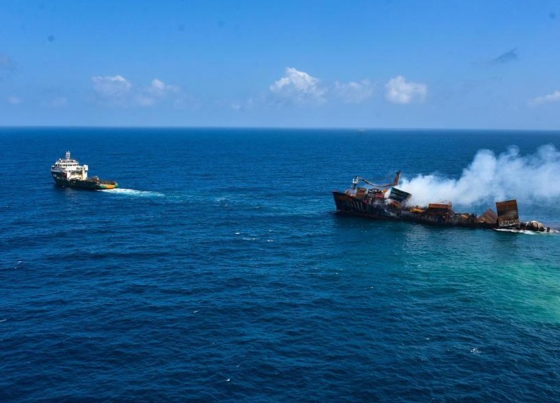 6月2日,斯里蘭卡總統(tǒng)戈塔巴雅下令將起火貨船“X-PRESS PEARL”號拖向遠離科倫坡港的深海區(qū),以防引發(fā)更大的環(huán)境災(zāi)難。“X-PRESS PEARL”號貨船5月20日抵達科倫坡港西北約9.5海里錨地時發(fā)出火警求救信號。斯里蘭卡海洋環(huán)境保護局官員5月28日表示,在科倫坡港附近起火燃燒的“X-PRESS PEARL”號貨船預(yù)計將會引發(fā)嚴重環(huán)境災(zāi)難。新華社發(fā)(斯里蘭卡空軍媒體處供圖)