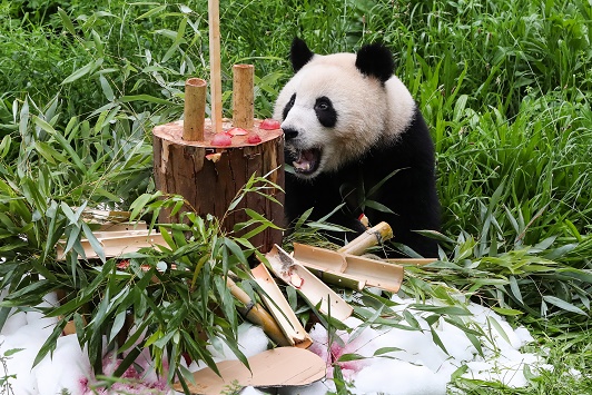 旅德大熊貓“夢夢”和“嬌慶”的雙胞胎幼崽“夢想”和“夢圓”31日迎來兩周歲生日,柏林動物園為它們舉辦了慶?;顒印?/p>