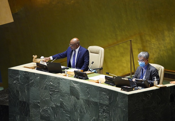 9月27日,在位于紐約的聯(lián)合國總部,第76屆聯(lián)合國大會主席沙希德(左)宣布一般性辯論閉幕。