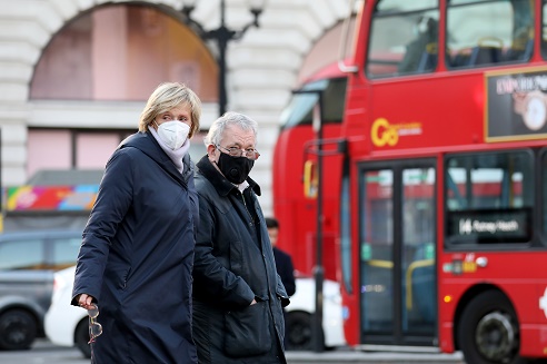 11月25日,人們?cè)谟?guó)倫敦佩戴口罩出行。