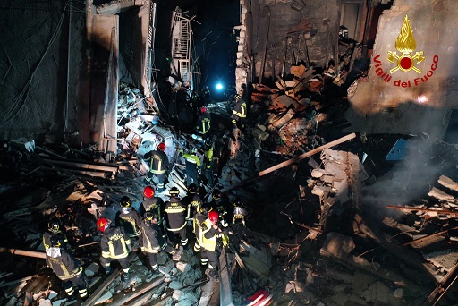 12月12日,消防員在意大利西西里島拉瓦努薩鎮(zhèn)的燃氣管道爆炸事故現(xiàn)場工作(無人機照片)。