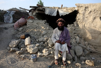6月26日,在阿富汗霍斯特省,一名男子坐在廢墟旁。