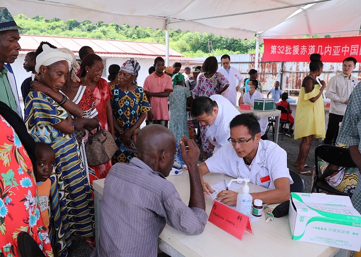 第32批援赤道幾內(nèi)亞中國(guó)醫(yī)療隊(duì)6月17日在赤道幾內(nèi)亞濱海省科戈市郊區(qū)的巴塔醫(yī)療點(diǎn)舉行義診,為當(dāng)?shù)鼐用窈椭匈Y企業(yè)員工提供診療服務(wù)。