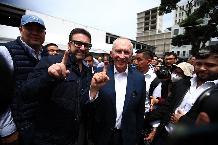 圖為25日,曾擔任聯(lián)合國前秘書長潘基文辦公室主任的“Cabal”黨候選人埃德蒙·穆萊特(左三)在危地馬拉首都危地馬拉城一處投票站參加投票。新華社發(fā)(烏利塞斯·羅德里格斯攝)