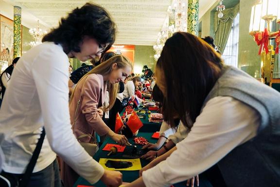 中俄兩國學(xué)生攜手奉獻(xiàn)了一場精彩的中國文化展演。民樂合奏《云宮迅音》、短劇《西游記之三打白骨精》、詩朗誦《沁園春?雪》、武術(shù)《武魂》和歌曲《嘻唰唰》《夢(mèng)想從心開始》以及精彩互動(dòng),充分展現(xiàn)了同學(xué)們中文學(xué)習(xí)成果和對(duì)中國文化的理解。書法、剪紙、雕版印刷、民族服飾等15個(gè)中華文化體驗(yàn)展臺(tái),吸引同學(xué)們紛紛駐足??绝?、肉夾饃等中國小吃讓來賓體驗(yàn)到中國飲食文化的豐富多彩。