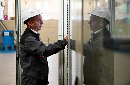 5月8日,在哈薩克斯坦東哈州的圖爾古孫水電站,水電站現(xiàn)場調(diào)度員涅波米亞什奇在發(fā)電機(jī)層巡檢水輪發(fā)電機(jī)組運行狀態(tài)。新華社記者 李任滋 攝