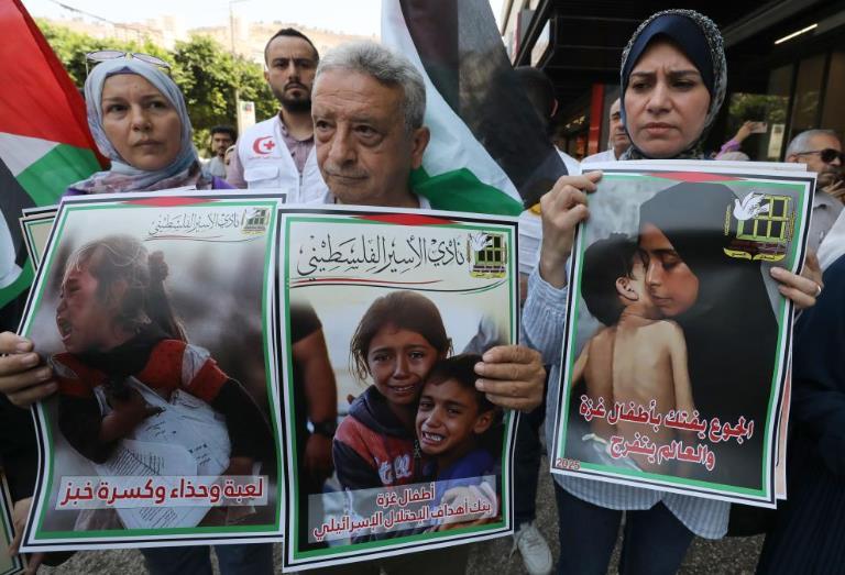7月29日,人們在約旦河西岸城市納布盧斯集會(huì),抗議以色列對(duì)加沙實(shí)施的饑餓政策,呼吁?;鹬箲?zhàn)。新華社發(fā)(尼達(dá)爾·艾仕塔耶?dāng)z)