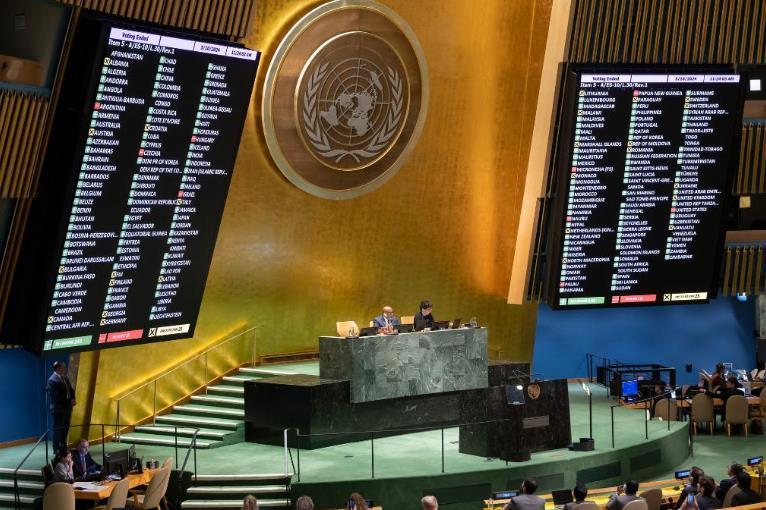 2024年5月10日,第十次聯(lián)合國大會(huì)緊急特別會(huì)議以143票贊成、9票反對(duì)、25票棄權(quán)的表決結(jié)果通過決議,認(rèn)定巴勒斯坦國符合《聯(lián)合國憲章》規(guī)定的聯(lián)合國會(huì)員國資格,應(yīng)被接納為聯(lián)合國會(huì)員國。新華社發(fā)(聯(lián)合國供圖/曼努埃爾·伊萊亞斯攝)