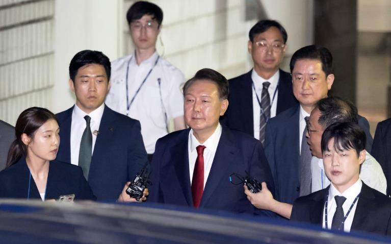7月9日晚,韓國(guó)前總統(tǒng)尹錫悅接受訊問后走出首爾中央地方法院。新華社/紐西斯通訊社