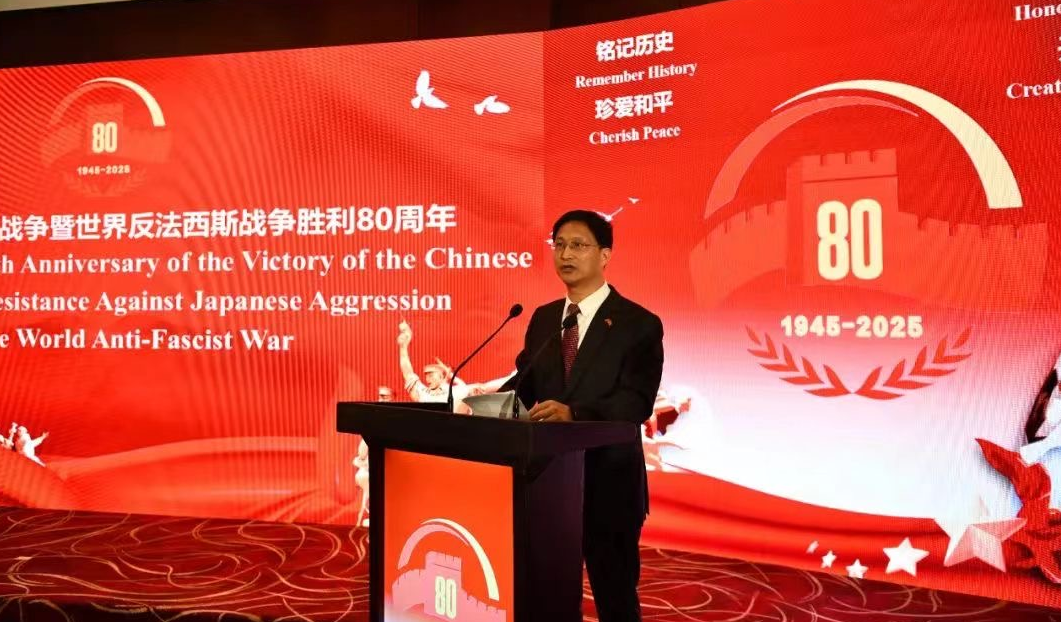 戚振宏大使在紀(jì)念中國(guó)人民抗日戰(zhàn)爭(zhēng)暨世界反法西斯戰(zhàn)爭(zhēng)勝利80周年招待會(huì)上發(fā)表講話(中國(guó)港灣 姜健/攝)