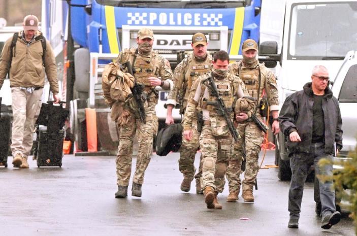 圖為當?shù)貢r間2025年8月28日,澳大利亞波爾潘卡,在搜捕一名與警察遭槍手槍殺案有關的逃犯期間,全副武裝的警察聚集在警務集結點。 CFP供圖