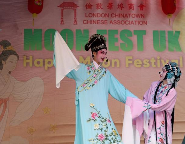 10月5日,演員在英國倫敦舉行的中秋節(jié)慶?;顒由媳硌輵蚯?。新華社記者 李穎 攝